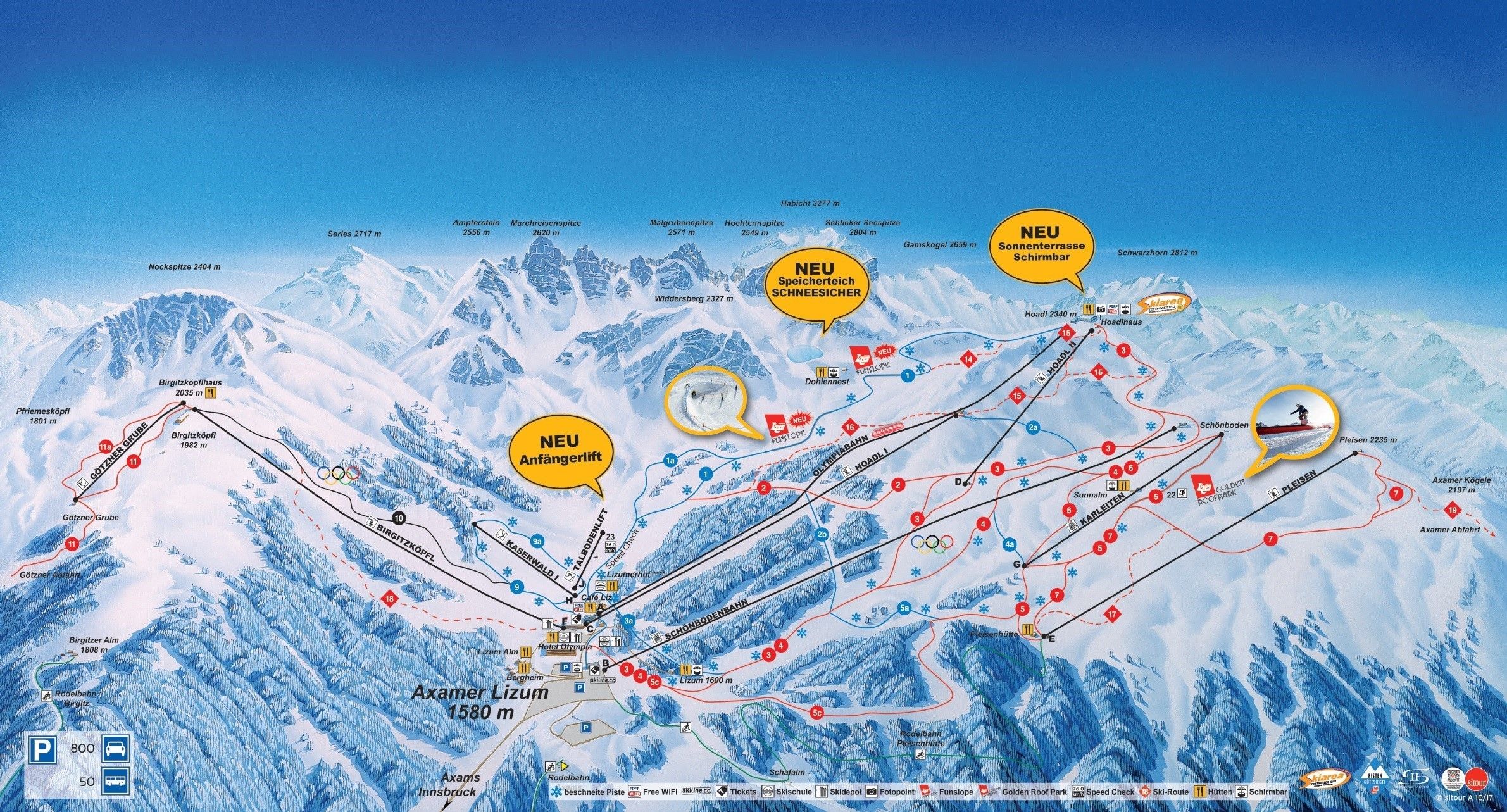The idyllic resort Axams is located at approx. 874 m altitude and is only approx. 13 km from the Tyrolean capital Innsbruck. It's sunny exposition in midst of the impressive mountain landscape is the reason why Axams is such a popular holiday destination. Although this place is known as the venue for the Winter Olympics in 1964 and 1976, the resort has maintained its tranquillity and Tyrolean charm. Various hotels, restaurants and apres ski bars can be found here, where you can let the day come to a cosy end. Further, there is a leisure centre in Axams, offering a multitude of free time activities. The Tyrolean capital Innsbruck invites you to stroll and admire the many beautiful sights it has to offer. About 5 km south of this resort lies Axamer Lizum, with direct access to the homonymous alp and ski area.Axamer Lizum