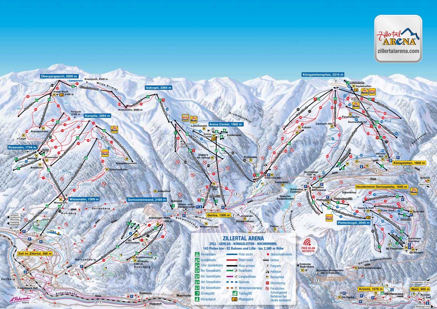 The region Gerlos-Königsleiten is located in the Gerlos valley, a side valley to the popular Zillertal. In the east, the region spreads beyond the border of the federal states Tyrol and Salzburg, so that the resort centre of Königsleiten is part of Salzburg. The famous Gerlos pass also leads over the state boarder on an altitude of 1,500 m. The ski lifts in Gerlos and Königsleiten as well as the family-friendly ski area Gerlosplatte-Hochkrimml all belong to the Zillertal Arena, the largest ski network in the Zillertal with approx. 143 km of piste. Thanks to 52 lifts you can enjoy limitless skiing fun from Zell am Ziller to Hochkrimml in two federal states.Travel Info Gerlos