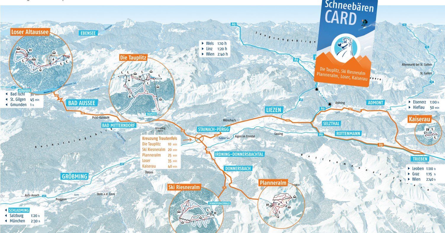 - By train: Tauplitz (in resort), Liezen (approx. 25 km), Salzburg (approx. 100 km)