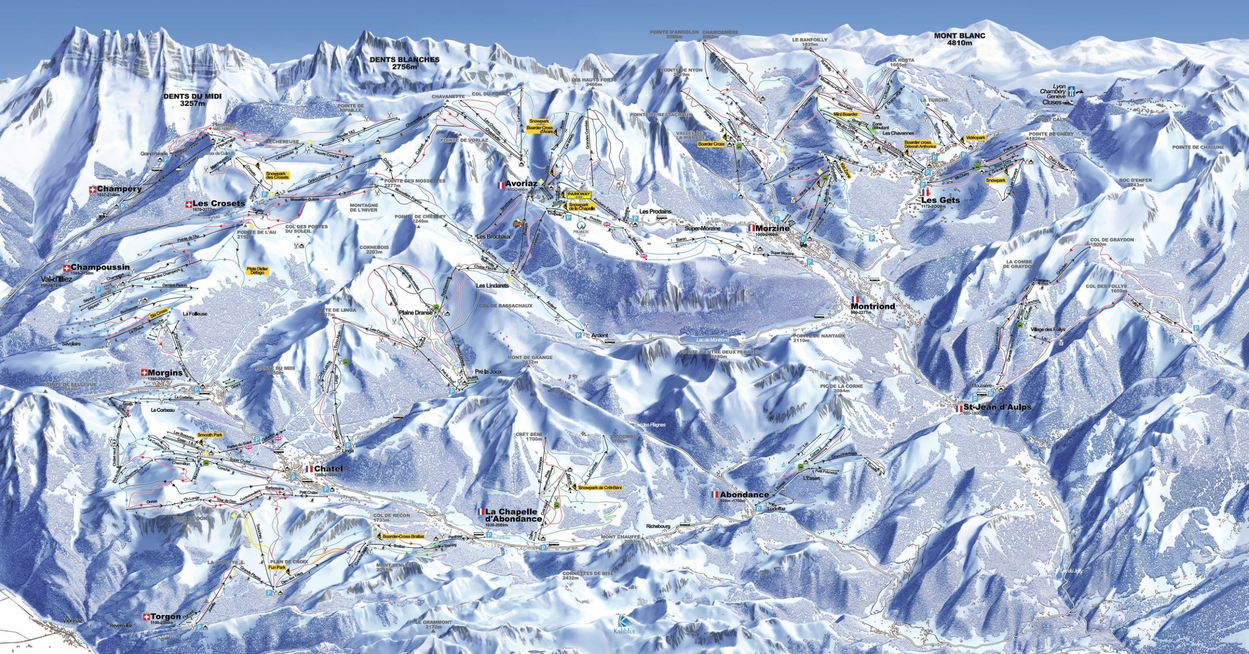 Les Portes du Soleil is located at the French-Swiss border, south of Lake Geneva. At times of high visibility it is possible to see the nearby Mont Blanc (4,807 m), Lake Geneva, as well as the neighbouring mountain chain Dents du Midi. This extremely diverse winter sport region, in the midst of jagged mountain masses, encompasses 12 ski stations, 8 of which lie in the French high Savoyard mountains and 4 of which lie in the Swiss Valais. No matter whether looking for a quiet family-friendly village or a bustling party zone, every tourist will be satisfied. The first-class ski area - which is one of the most extensive ones worldwide with 580 km of piste - is an absolute must-see for every skier. The higher altitudes are very snow sure while the lower ones are assisted by snow canons.