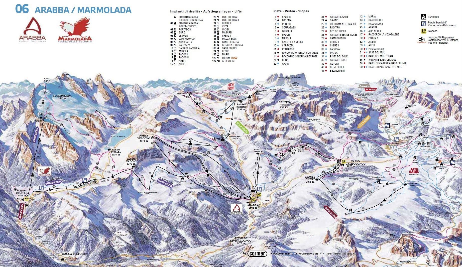 In the middle of the Dolomites lies the Ladin valley of Livinallongo Col di Lana, through which the river Cordevole flows. In the province of Belluno in the Veneto region, this valley is characterised by wide fir tree forests, snow-covered mountain massifs and broad terraces, and encompasses 100 square kilometres with only 1300 inhabitants. The residents are spread out over 29 districts, one of which being the winter sports resort of Arabba.Winter sports fans value Arabba as a winter sport resort in particular because, as a result of its altitude at the foot of the Mormolada Glacier (3,342 m), it is particularly reliable for snow. Here, for example, you can find the perfect access point to the world-famous Sellaronda, which connects all four Dolomite passes to one another. On this circuit, skiers won't need to unfasten their skis at all! However, mountain lovers should also not miss out on the Alpine pass Pordoijoch or the mountain pass Passo di Falzarego.