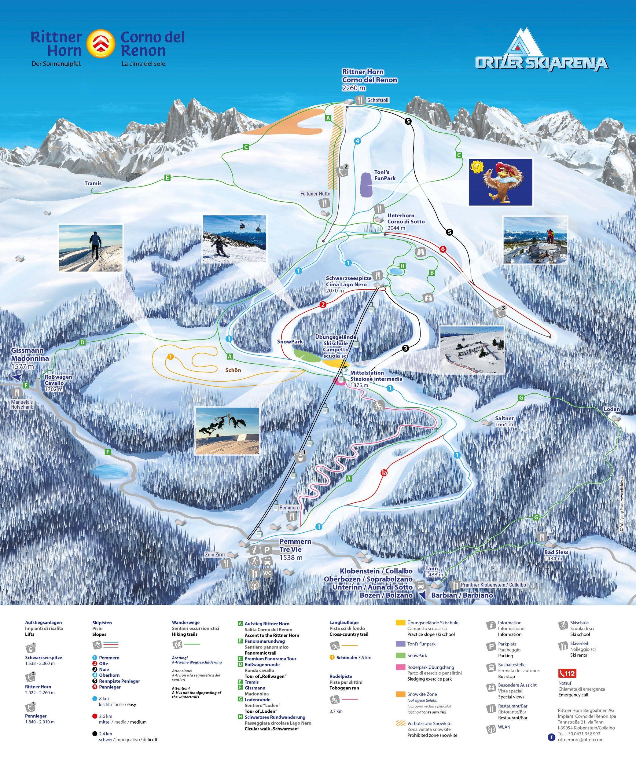 Around Bolzano, you will find 12 ski areas that form part of the "Dolomiti Superski" union, providing for some variety (see ski region) - with an incredible total of 1,200 piste kilometres and 450 lifts.