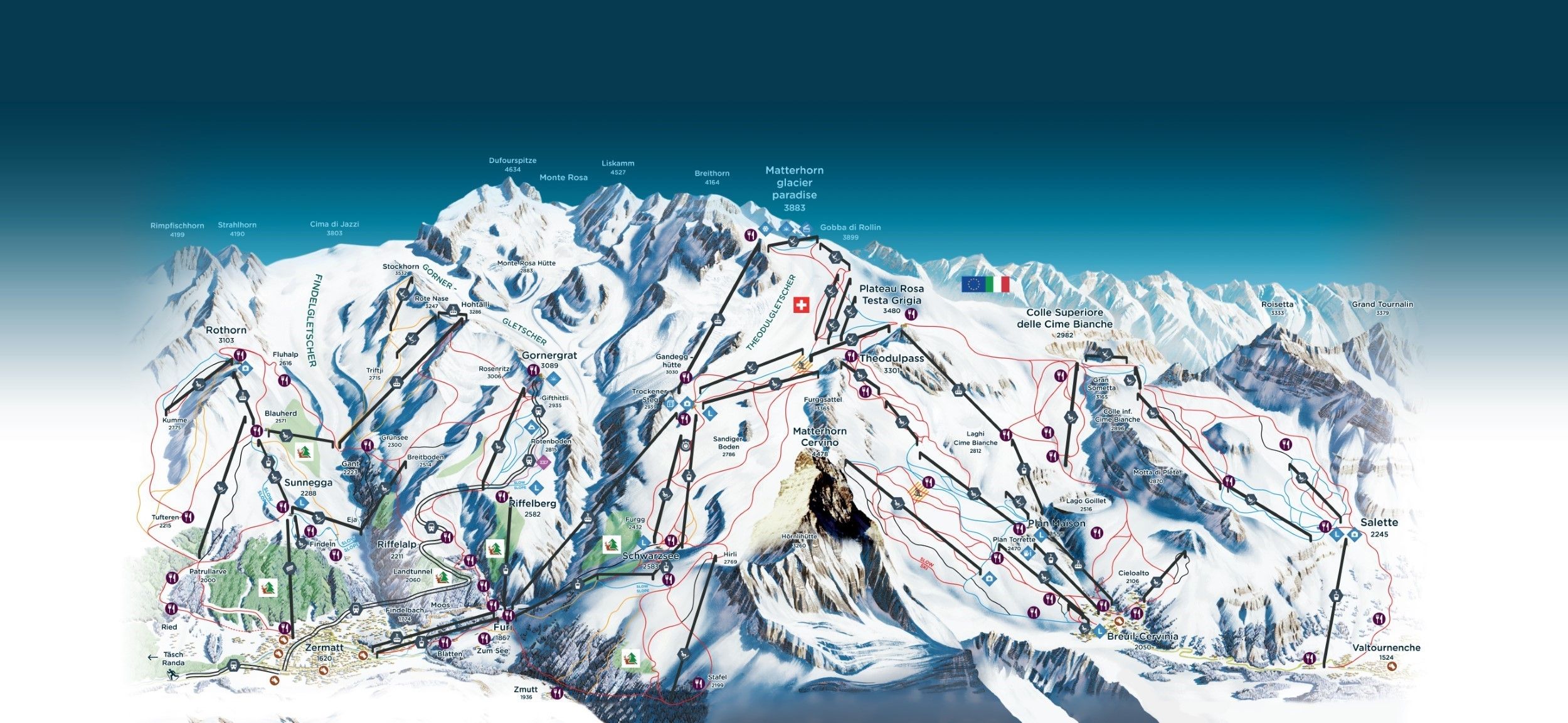 The "Zermatt-Matterhorn" destination is composed of the three resorts Zermatt, Täsch and Randa. The region is situated in the heart of the Wallis Alps and is surrounded by approx. 38 "4,000s". Zermatt is located at the foot of the most famous mountian, the Matterhorn. The gorgeous landscape offers a snow-sure ski area with many mountain restaurants, which guarantee an unforgettable panoramic view. In addition to skiing or snowboarding, guests also have the opportunity to go ice climbing, paragliding or snow shoe hiking. Once in resort, visitors should also take a glance at the world-famous Swiss watches and pocket knives.Travel Info Zermatt